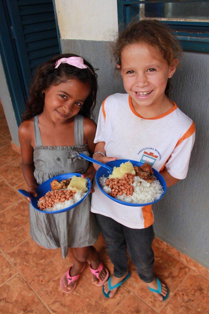 Students in Brazil hold up plates full of rice, beans and cassava from WFP.