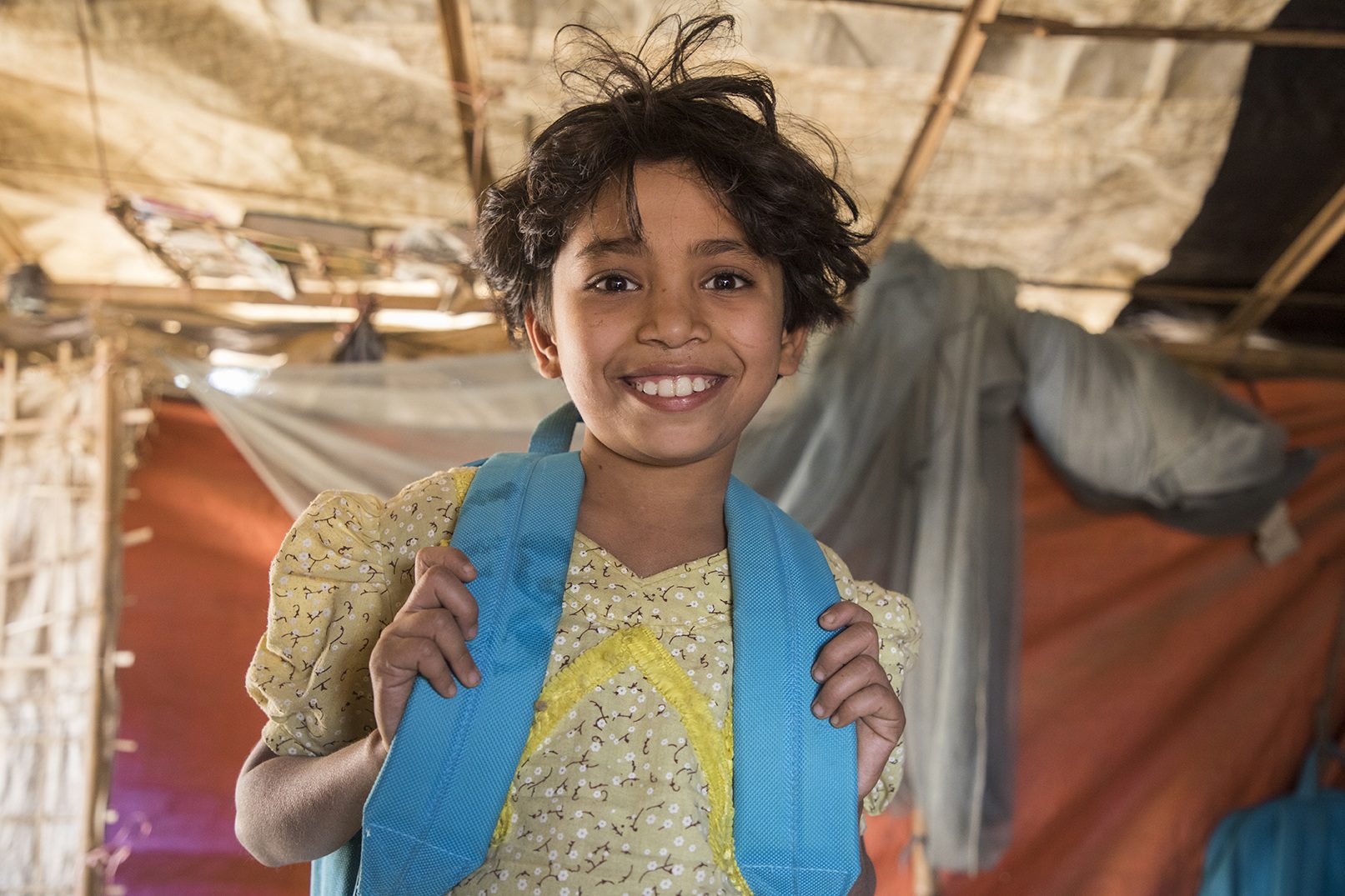 She goes to class inside a UNICEF-supported school in the makeshift camp of Balukhali in Cox’s Bazar, Bangladesh. It’s one of more than 1,000 “child learning centers” scattered throughout an area now considered the largest refugee camp in the world.