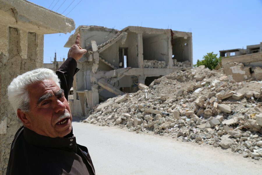 Syria: A man points to the ruins of his home in Rural Damascus, in May 2015 — today 12.4 million people in the country are weathering the worst food crisis since the start of the decade-old conflict in 2011.