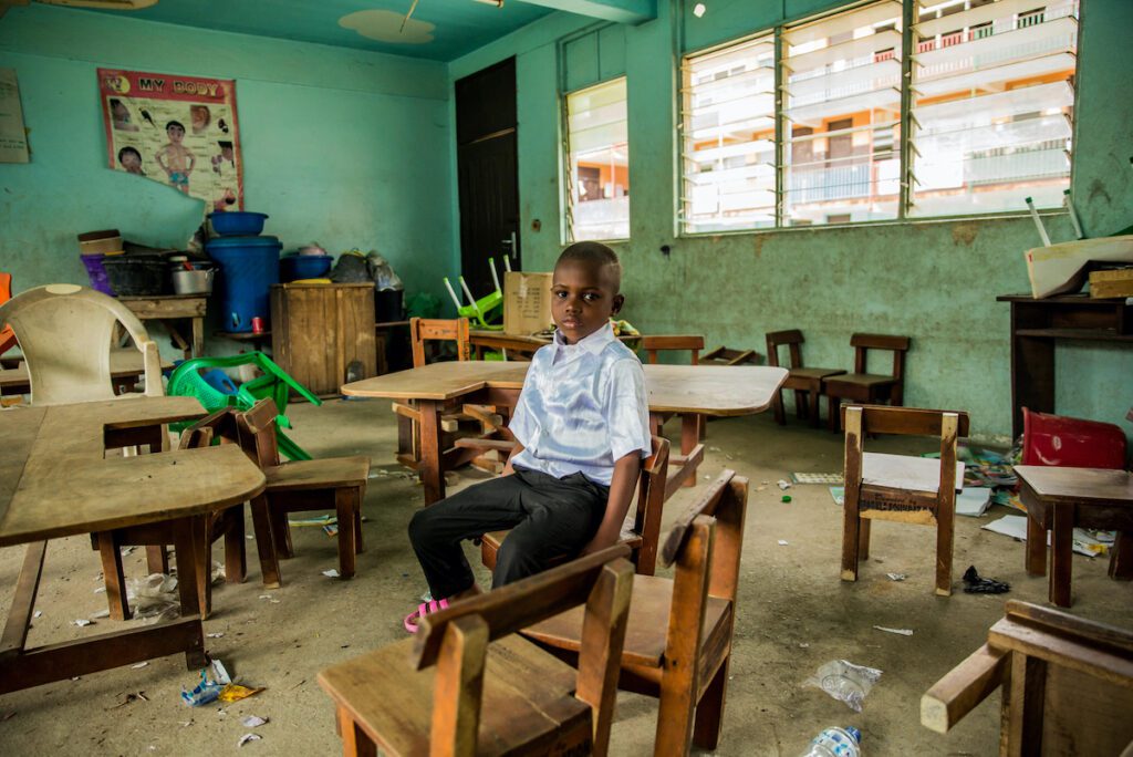 David, an eight-year-old student, sits in his empty classroom in Makoko, Lagos.