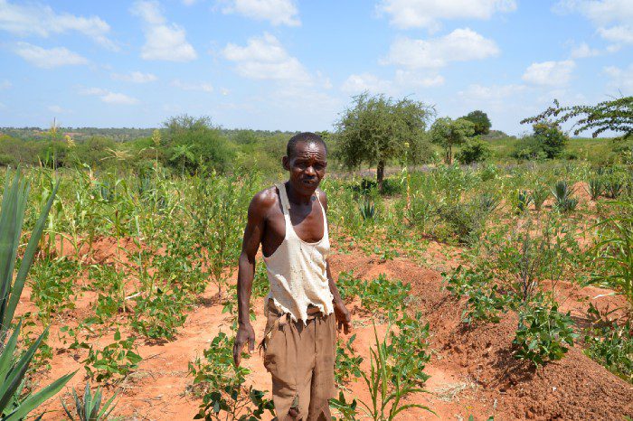 Matei doesn’t just store water in large and small bottles. His farm in Katuni village, north of Mwingi town in southeastern Kenya, is a puzzle of canals punctuated by shallow ponds, all to break the force of surface run-off water and coax it to seep slowly into the soil.
