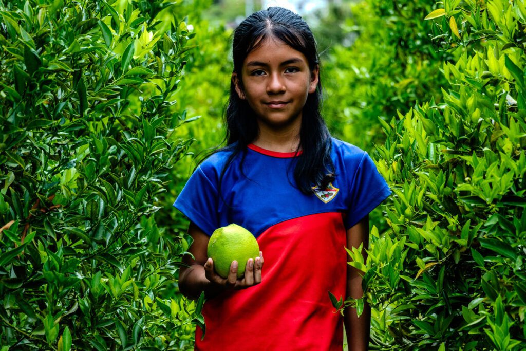 Julieth is a student in Ecuador. She is proudly holding some fresh produce grown by local farmers that will be used to prepare school meals.