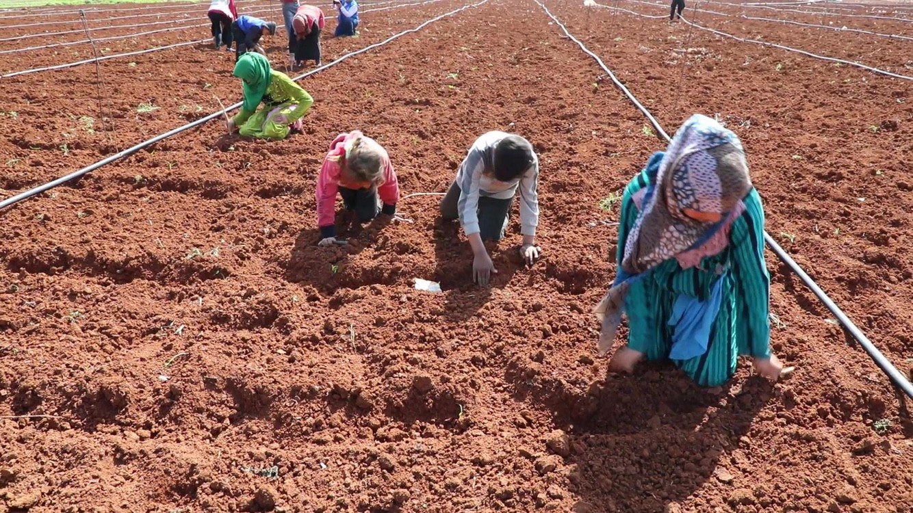 A few kilometers away I meet 11-year-old Montaha and her siblings. They work on their hands and knees, poking holes in the dirt with sticks. The tracks of their labors stretch across the fields like ribbons weaving around burnt out tanks and other carcasses of war.