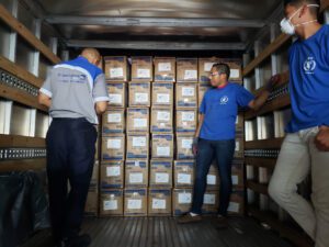 In Panama City, Panama, the U.N. World Food Programme is supporting logistics for WHO’s activities in South America. Above, WFP staff at the UN Humanitarian Response Depot prepare to dispatch 13 consignments of personal protective equipment for healthcare workers across the region. This equipment, specifically, will be shipped to 13 countries, including Bahamas, Belize, Chile, Costa Rica, Colombia, Cuba, Dominica, El Salvador, Guyana, Jamaica, Suriname, Trinidad & Tobago, and Uruguay.