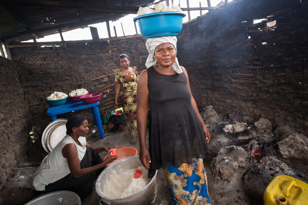 Three women in the Democratic Republic Congo (DRC) prepare meals for a school full of children. Large rocks arranged in a circle on the ground form the fire pit, and a blue plastic table is the main food preparation area. The angled, open roof allows light to come in and smoke to escape. Over 60% of the people the U.N. World Food Programme serves in the DRC are women.