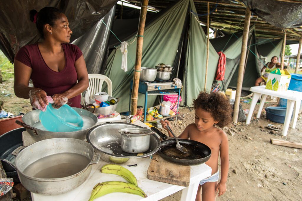 Natural disasters strike without warning. The 7.8-magnitude earthquake that struck Ecuador in 2016 killed more than 650 people, injured more than 7,000, and left 500,000 in need of humanitarian assistance. Rosa Mariluz and her children lost everything, which is when the U.N. World Food Programme stepped in. Here, she cleans up after a meal in her post-earthquake kitchen – a small white table with one pan for washing and another for rinsing.
