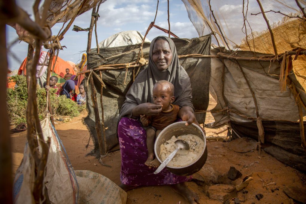 30-year-old Sacdiya Mohamed Noor makes a meal for her one-year-old son at a Somalian refugee camp. This makeshift tent is her kitchen – little more than some branches and discarded sheets of plastic tied together around the joints. Sacdiya and her children were forced to leave their home due to severe drought. With assistance from the U.N. World Food Programme, they were able to observe Ramadan with the little food they have.