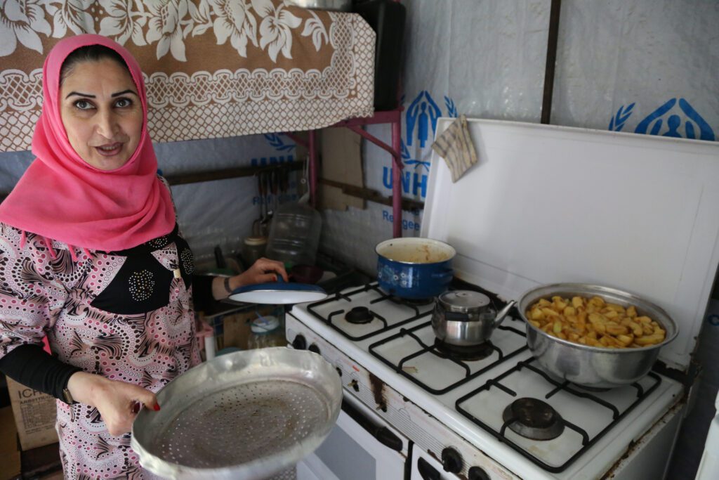 In her pink scarf, Um Mohamed cooks U.N. World Food Programme provided rice and stews apple slices in sugar syrup for her family to eat at a Syrian refugee camp. Camp management built her kitchen by using free space in front of her tent to create an extra room by welding metal bars together and using plastic sheets as walls.