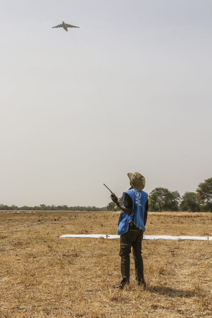 These WFP staff on the ground, known as drop zone coordinators, travel to some of the country’s most dangerous, hard-to-reach locations and work with the community to identify a safe, dry area where as much as 60,000 pounds of food can be safely dropped. Then the coordinator marks the area with a large white “X” in spray paint and clears the space of both people and livestock.