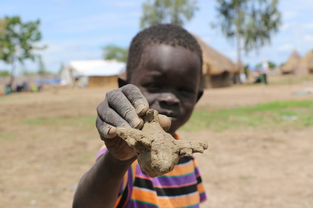 These airdrops have become such a common sight in South Sudan’s Unity State that children there have started making toy versions out of mud. Seven-year-old Peter Mabor, pictured below, told George he likes to play with his toy plane as he watches WFP’s food drop from the sky. In South Sudan, the agency’s planes are called “gwads,” or large wings.