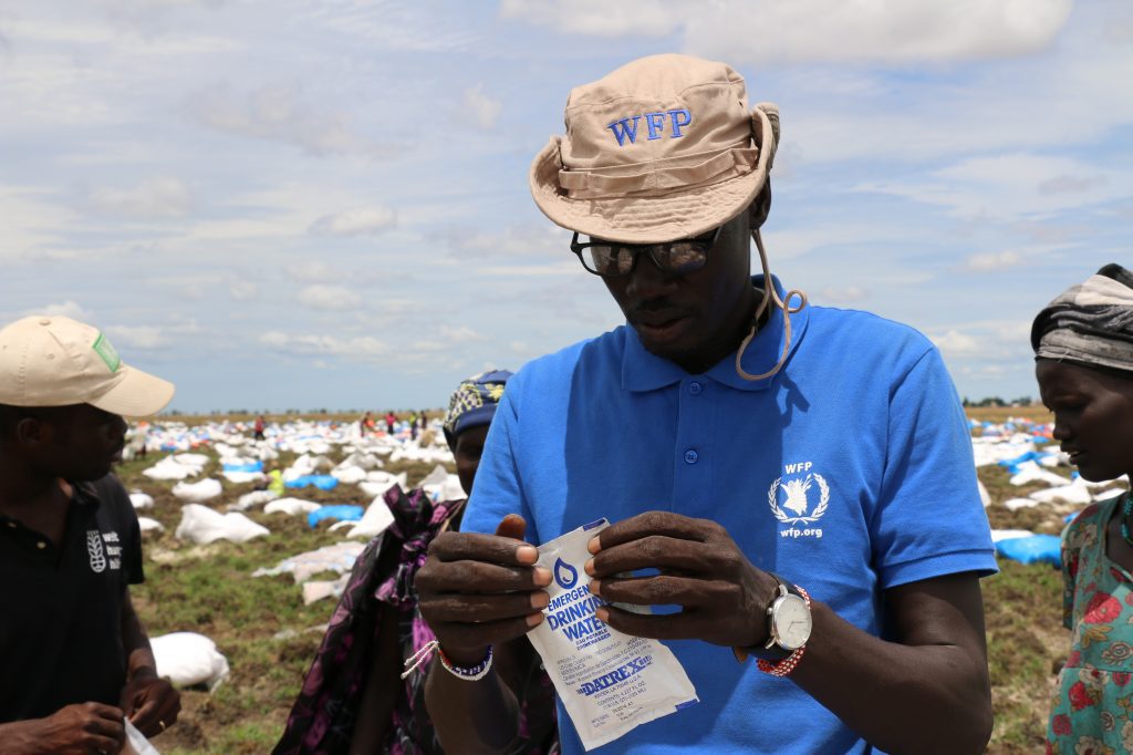 WFP drop zone coordinator, Kang Koriyom, opens a packet of drinking water after an airdrop in Ganyiel, Unity State.