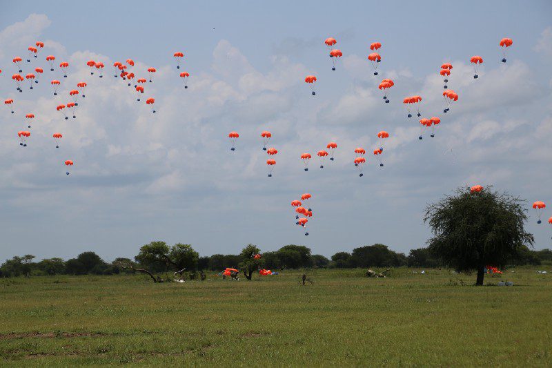 When weather and ground conditions are good, WFP’s country office in South Sudan can conduct up to 16 airdrops per day, dropping approximately 30 metric tons of food each trip, which can feed some 2,000 people for a month. These food supplies typically include some kind of grain or cereal, such as sorghum or corn, pulses like yellow split peas, beans or lentils, and nutrition products like SuperCereal, which treat and prevent malnutrition among young children, pregnant women and nursing mothers.