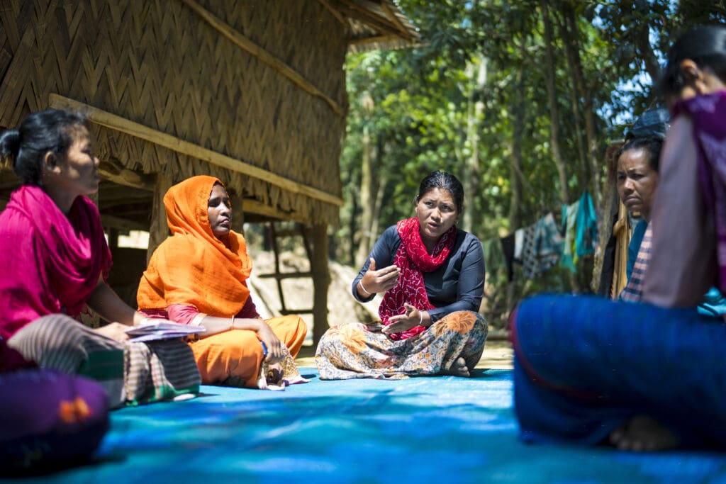 Taimy (center), a participant in WFP’s Livelihoods program in Bangladesh, helps other women with their businesses.