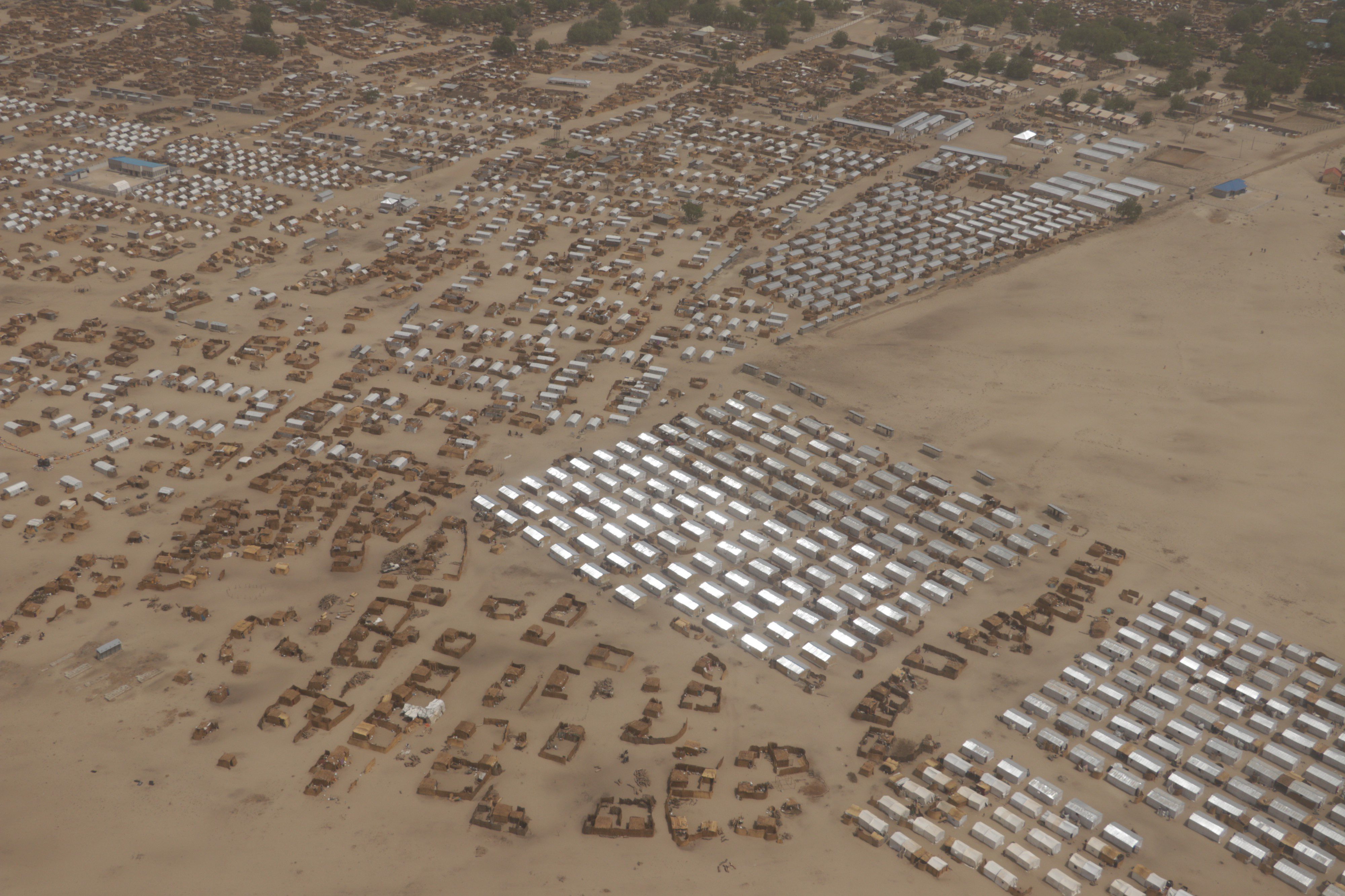 Seen from the air, the camps in Monguno appear to be taking over the town. Ordered grids of single-roomed shelters, their tin roofs glinting in the sun, stand out among the local mud brick houses.
