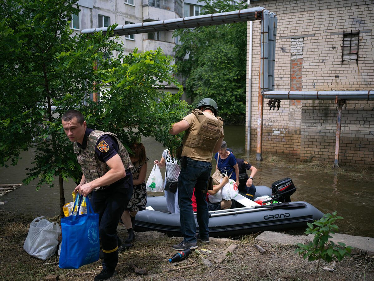 Residents evacuate by boat in Kherson, Ukraine, after flooding. WFP provided emergency food assistance to the region.