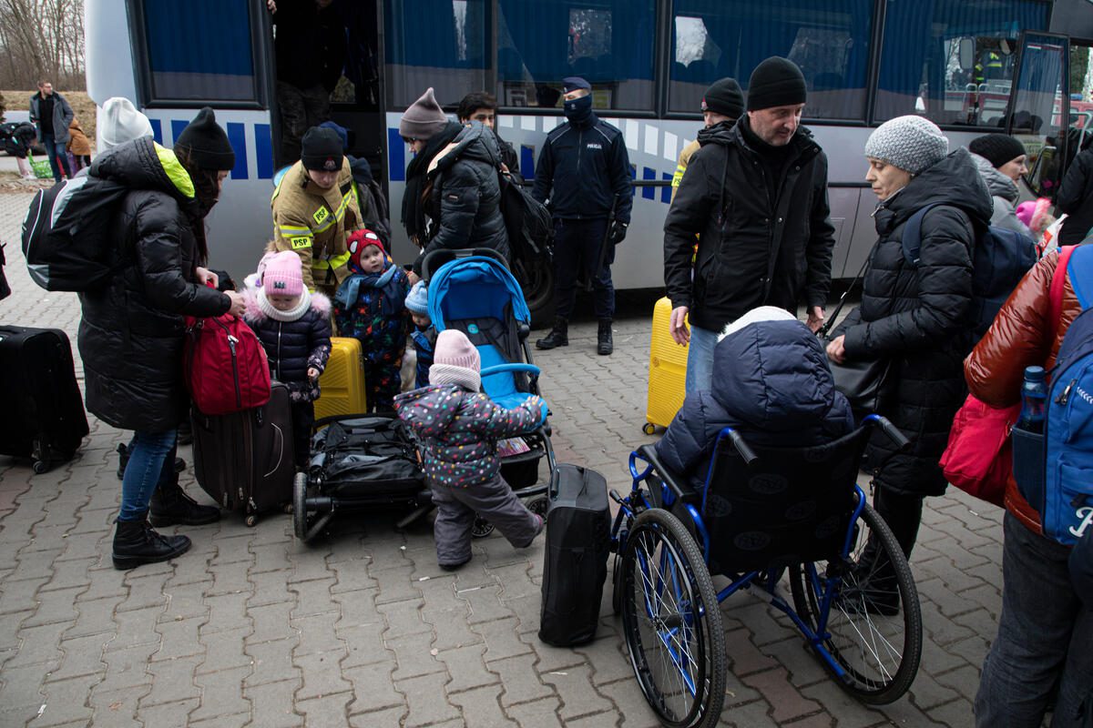 In the Photo: Ukrainian refugees arrive by the hundreds at a transit center for housing and processing refugees in Hala Kijowska, around 100 km from Rzeszow, Poland, 6km from the border with Ukraine. These families can now rest and have hot meals and beverages to recover from the journey.