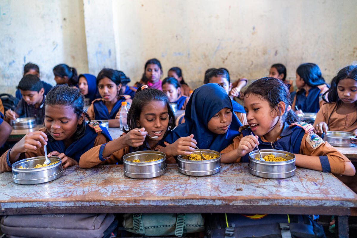 Many of our school meals programs serve double duty by giving schoolchildren the nutritious meals they need while sourcing food from local farmers. At the Morakhola Government Primary School in Bangladesh, vegetables for these girls’ school meals were bought from female farmers nearby.