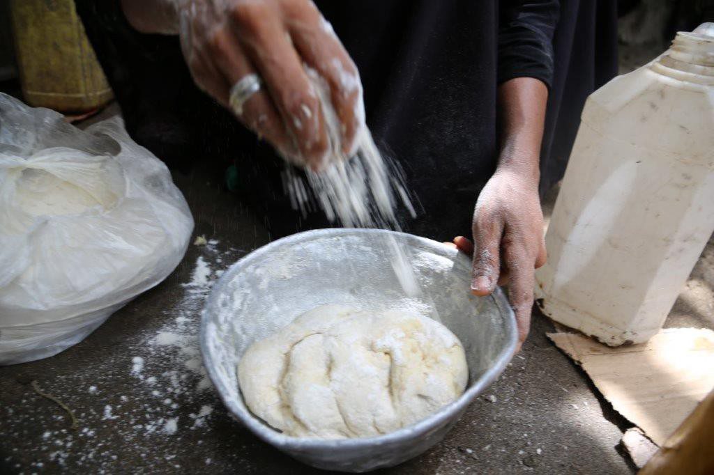 Aisha kneads bread dough. For a family like theirs, the flour and oil they receive are worth almost half their monthly income. Families in this poor area in Hodeidah eat only bread on most days.
