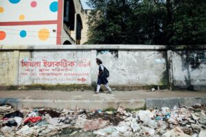 Standing in a doorway to the alley, Shrity brushes her teeth before sitting on the bed she shares with three other people. Here, she finishes her homework and eats a quick meal of rice and lentils before walking the littered streets to school.