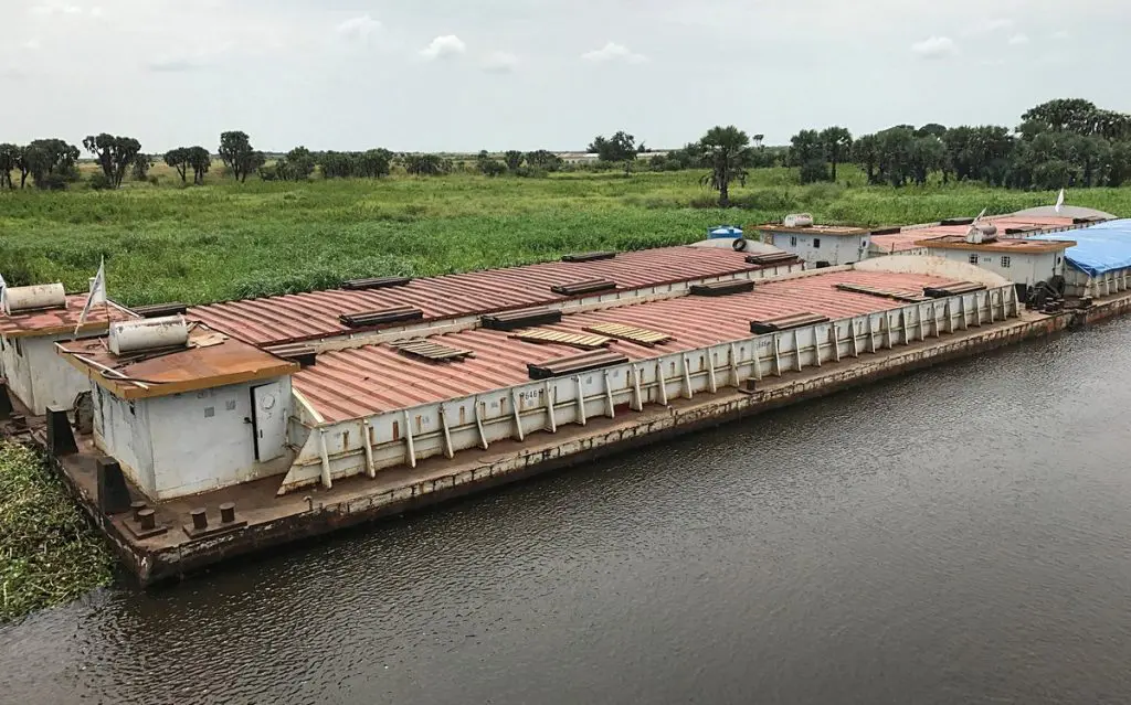 WFP/South Sudan. A barge carrying 2,250 metric tons of mixed commodities arrives in Malakal, South Sudan.