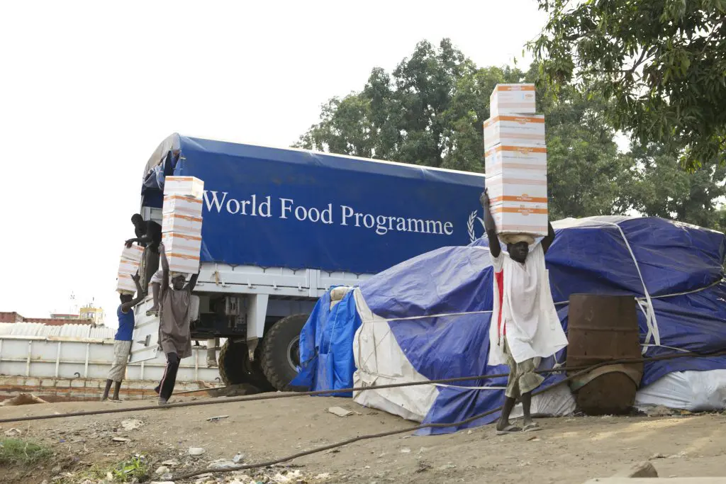 WFP/Ahnna Gudmunds. Volunteers unload WFP humanitarian supplies in Juba, South Sudan.