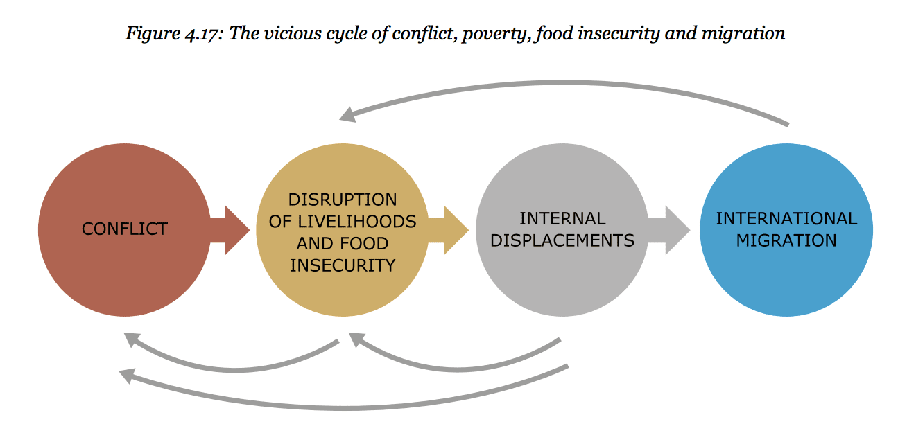 The finding that food insecurity is a critical ‘push factor’ in migration, especially when combined with violence and instability is also stated in the report. WFP estimated that refugee outflow was the greatest in countries with high levels of conflict and food insecurity. In a dangerous causal loop, researchers found that a lack of access to food fuels migration, which in turn increases the likelihood and intensity of conflict.